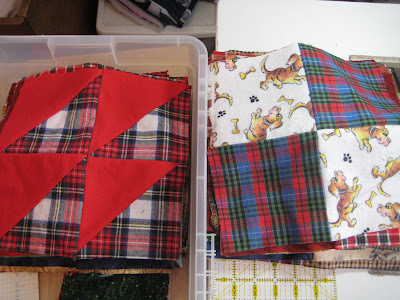 Today I took the "foursies" of flannel waste triangles that I put together a few days ago, and I have been seaming away. It is six blocks by nine, so forty intersections to match through the machine. O my gosh, was it really that many? No, it was eighty, two intersections per block.