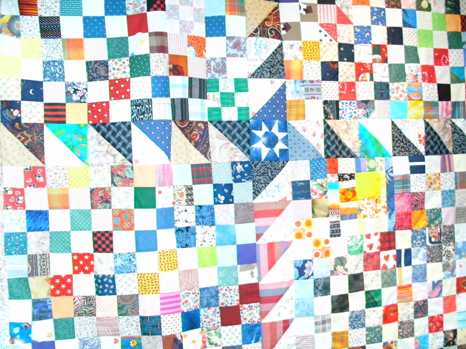 Here's the whole thing, 47" x 60", not big enough for a twin bed, but a "snuggle" quilt. For someone who likes bright colors! Another UFO bites the dust.