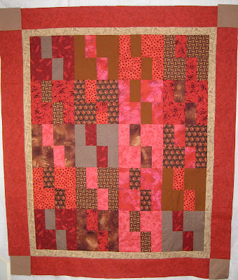 Today I did move one of them along. With fabric from Joey in the World Wide Swap I added the final borders to this "Pyramids & One Teepee" quilt. She sent just the right maroon/red fabrics to go with the flowered triangles from long ago. Her fabrics inspired me to also sew together more of the same colors for the backing, so this is now ready for home quilting.